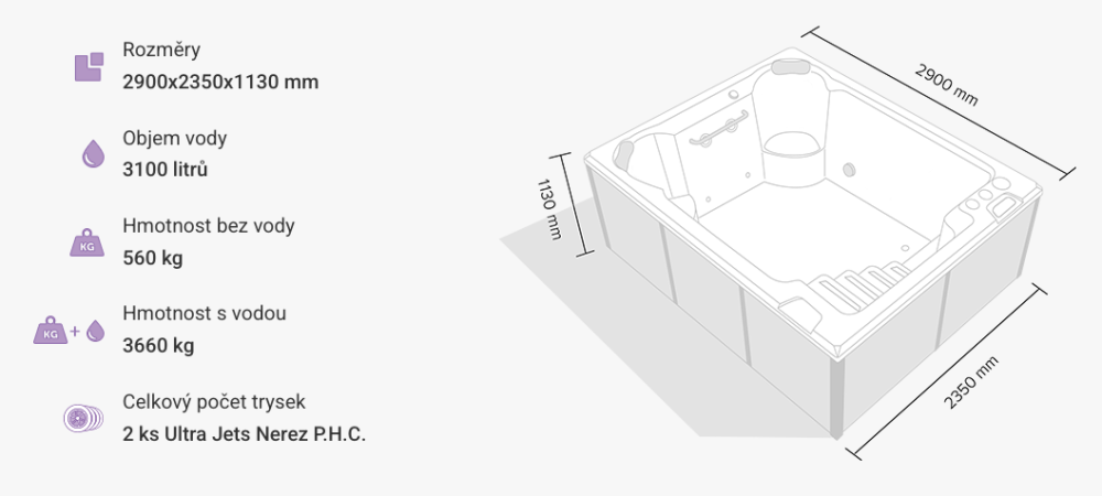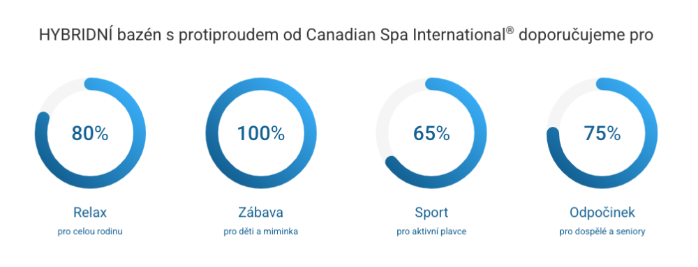 Seznamte se s prvním HYBRIDNÍM bazénem, který patří mezi naše nejmenší SWIM SPA nejen pro nejmenší. Vytvořili jsme pro Vás a Vaše malé děti pohádkový bazének s vlastnostmi pro dospělé, do kterého můžete po bezpečném schodišti vstoupit i s malým miminkem. Celoročně teplá voda s minimálními provozními náklady Vám umožní nejen učit Vaše děti plavat, ale i vyrůstat a samostatně splývat s vodou. Pro rodiče a větší děti jsme do tohoto romantického modelu implementovali plavecký protiproud pro nekonečnou zábavu, hry ale i plavání a masáže pro dospělé. Hlídající rodiče, starší sourozenci nebo prarodiče si mohou nechat masírovat svá unavená záda v naprosto unikátních masážních křesílkách a z bezpečné vzdálenosti na dosah tak pohodlně střežit své ratolesti. Pozvěte své děti do malého vodního světa a užijte si každý okamžik plný štěstí a radosti. Vhodný pro dospělé, rodiny s dětmi, seniory, batolata, malé děti, celoroční dovádění v teplé vodě. Vhodný i pro neplavce. Možnost využít protiproud na plavání a masážní sestavy pro hydroterapii.